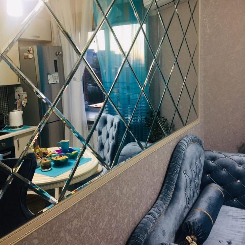 Использовалась серебристая зеркальная плитка формы "вытянутый ромб".